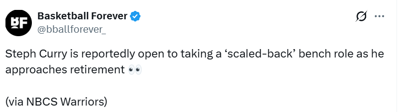 “你想想文斯-卡特,生涯最后几年他就是一半角色球员、一半导师兼第七助理教练那种感觉。”贝克补充道,“还有生涯末期的保罗-皮尔斯、格兰特-希尔。作为NBA传奇,你可以有很多种谢幕方式。我们聊到这点时,库里显得非常坦然。他不介意,如果自己状态下滑、慢了一步甚至两步、再也打不了首发。他原话大概是:‘我不想在防守端变成一个桩子’,但他永远都能投篮。”
